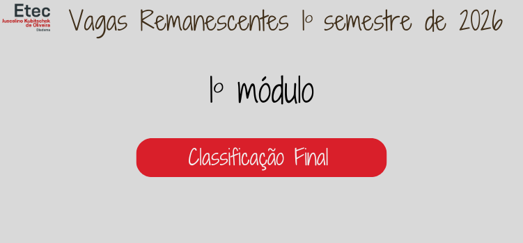 Confira o resultado da Classificação Final do Processo de Vagas Remanescentes para o 1º módulo. Convocação para matrícula será efetuada dia 05/03/2026. Confira o edital.