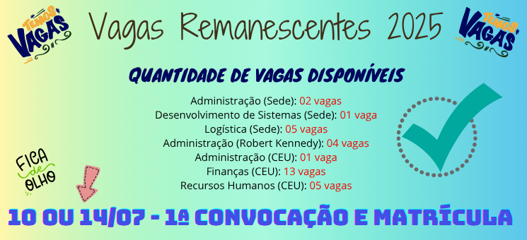 Em virtude da dedetização na unidade sede, em Diadema, as matrículas dos candidatos convocados serão realizadas nos dias 10 e 14 de julho.