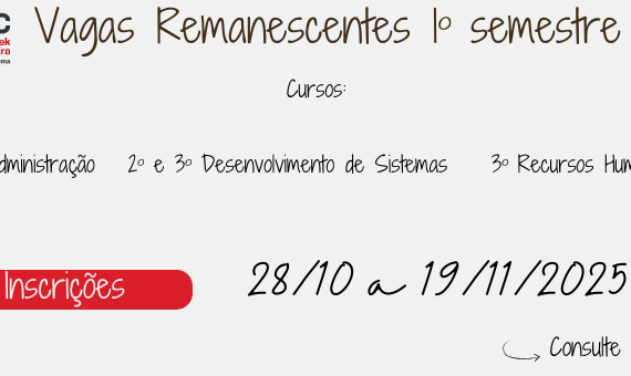 Estão abertas as inscrições para o Processo Especial de Seleção de Candidatos para preenchimento das vagas remanescentes dos cursos técnicos para os 2º e 3º módulos, de 28/10 a 19/11/2025. Confira o Edital.
