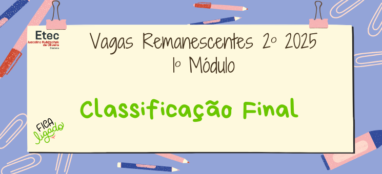 Confira a Classificação Final do Processo de Vagas Remanescentes para o 1º módulo.