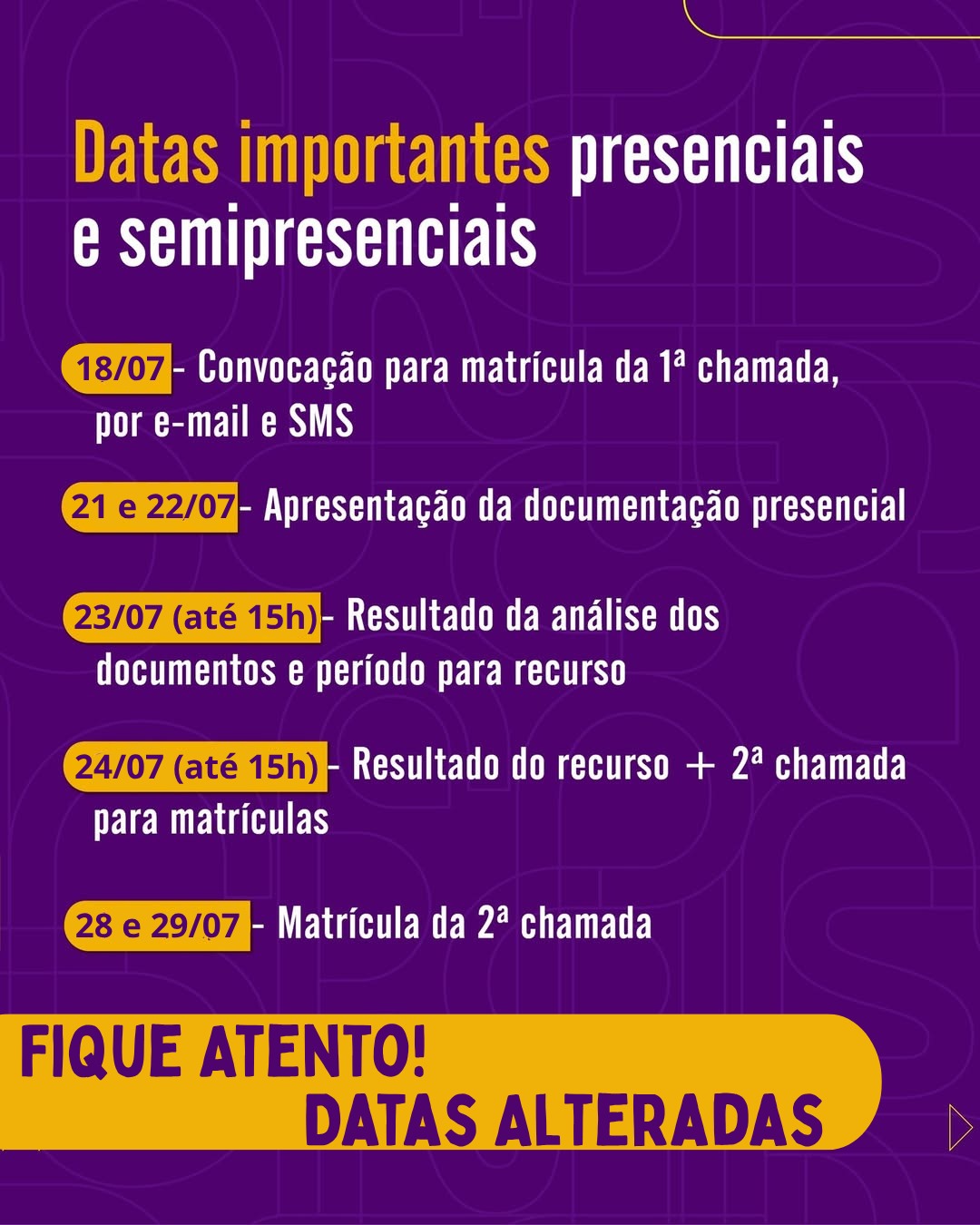 - Dias 21 e 22 de julho: matrícula dos candidatos da primeira chamada, com apresentação da documentação.